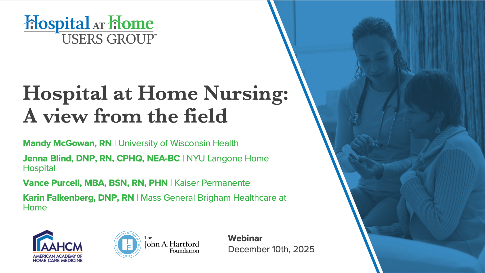 The Hospital at Home Users Group, in partnership with the American Academy of Home Care Medicine, is pleased to present our latest webinar for hospital and system leaders interested in learning about the opportunities and challenges associated with providing acute care in the home.